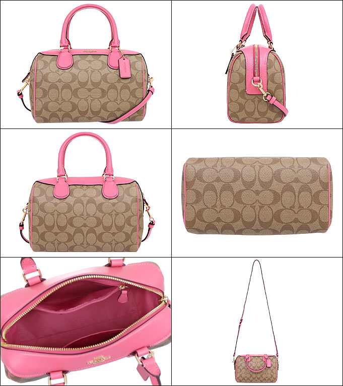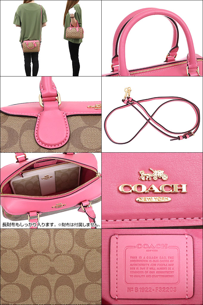 ●【コーチ COACH】 ラグジュアリー シグネチャー PVC レザー ベネット ミニ サッチェル 名称SIG MINI BNT STCHL 種類 バッグ/ショルダーバッグ サイズ 横幅:23cm 高さ:17cm マチ:12cm ハンドル:27cm ショルダー:117cm〜135cm 重さ:490g 仕様間口:ファスナー開閉 内部:ファスナーポケット×1 オープンポケット×1 ショルダー:取り外し可能、長さ調節可能 ●コーチの長財布が入ります 素材PVCコーティングキャンバス×レザー カラー カーキ×ピンクルビー IMCMY 【金具の色】ライトゴールド 型番 F32203 付属品 なし 【2019 春夏 新作】 コーチ COACHのバッグ(ショルダーバッグ)です。