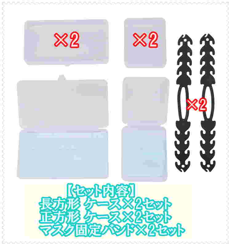(24時間発送ができるAmazon倉庫に物流業務を委託し迅速で確実なお届けを実現しています)・ハードマスクケース 長方形、二つ折り用各2個とマスクバンド2本セット・セット内容:マスクケース(長方形)×2点、(二つ折り)×2点、マスクバンド×2本・サイズ:マスクケース(長方形)/長さ17.5cm 幅9.5cm 厚み2.5cm (二つ折り)長さ11cm 幅9cm 厚み2.5cm マスクバンド/長さ18.5cm 幅2cm 厚さ0.24cm・材質:ケース/ポリプロピレン(PP)バンド/シリコン 重量:ケース(長方)/84g (二つ折り)/36g バンド/8g カラー:ケース/クリア バンド/ブラック 収納枚数:長方/12枚 二つ折り/5枚・マスクの収納や持ち運びに便利なケース。
