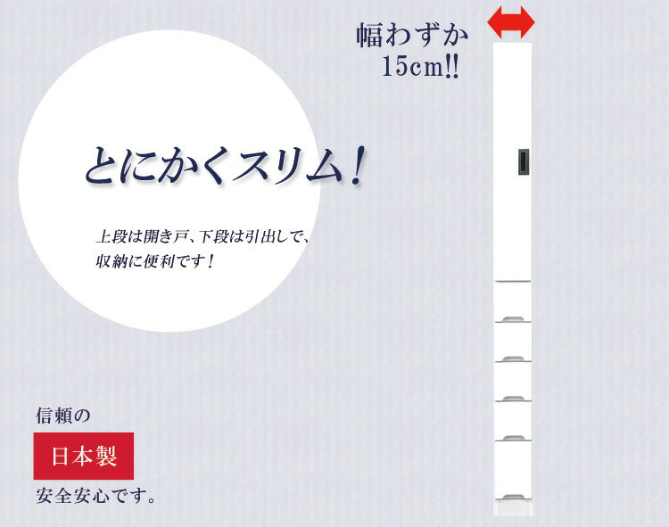 メーカー希望小売価格はメーカーカタログに基づいて掲載しています隙間収納 すきま収納 幅15cm 食器棚 スリム食器棚 ホワイト 開き戸タイプ 板扉 スリム 引出し付き キッチンボード キッチン収納 ダイニングボード 収納 木製 キッチン 洗面所 玄関 国産 可動棚 送料無料